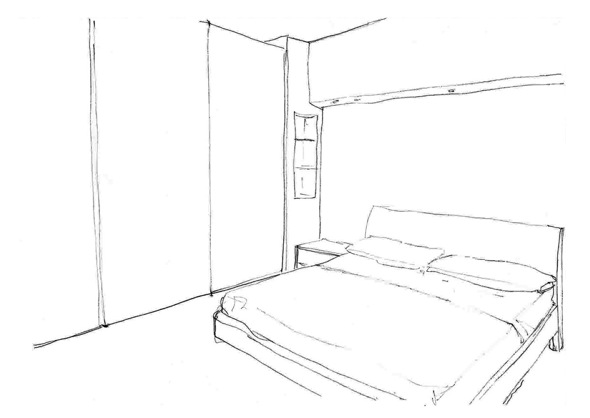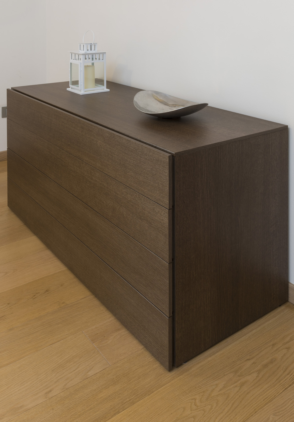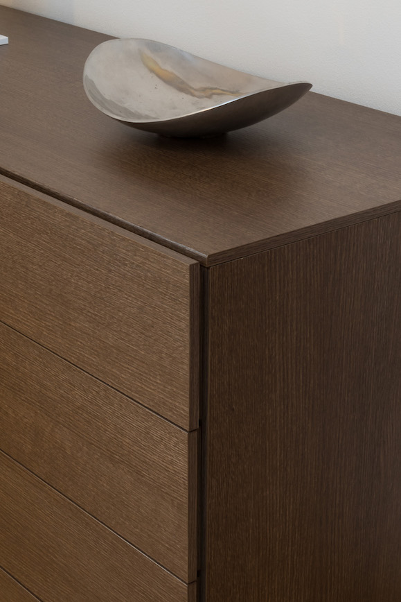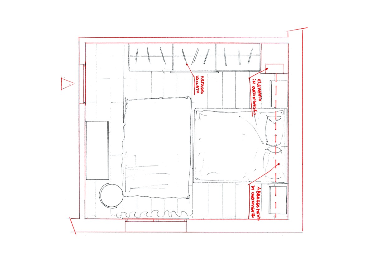 Particolare della colonna con nicchie realizzata nell’angolo tra armadio e comodino. L’abbassamento sopra la testiera, ha permesso di inserire un’illuminazione soft.